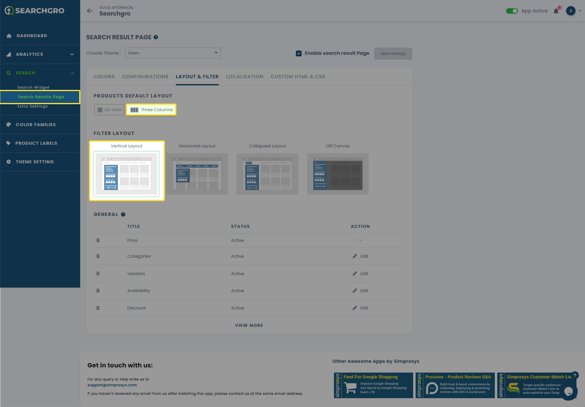 The SearchGro app provides extensive options to customize the layout of the search results page and configure how filters are displayed and managed.