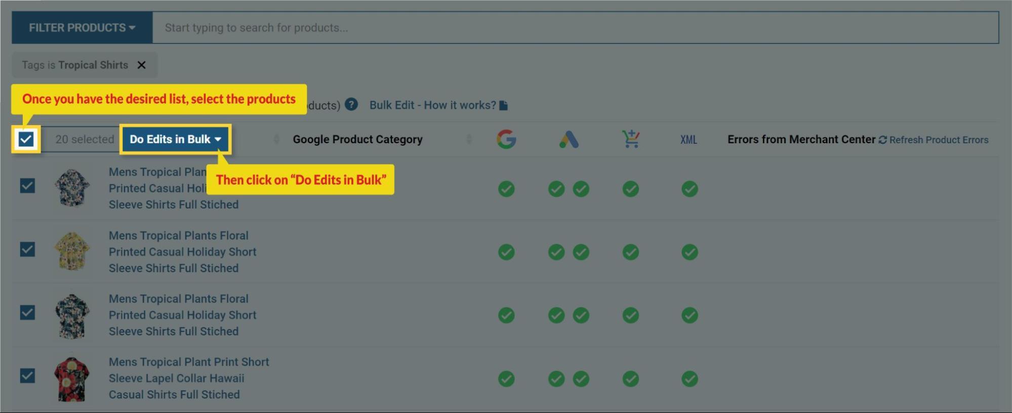 3. Once you get the product list, select all those products or a single product to which you want to assign the custom label and click on “Do Edits in Bulk”