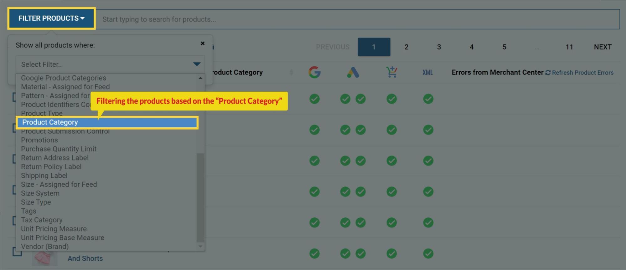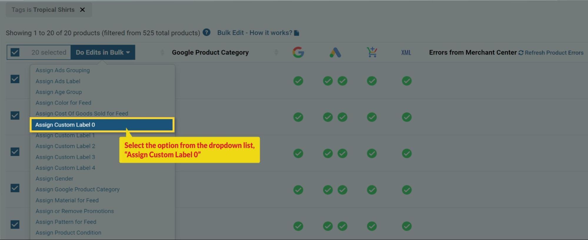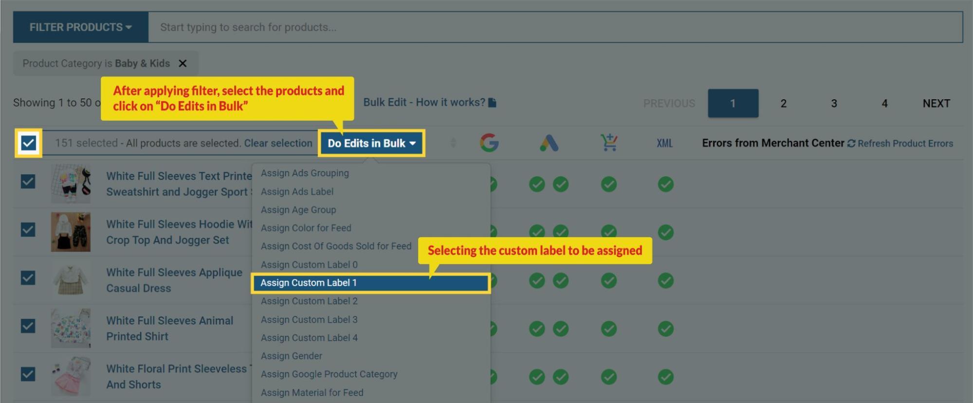 To check them, Go to the “Manage Products” tab from the plugin’s dashboard, click on “Filter Products” and select the option of Custom Label 1.