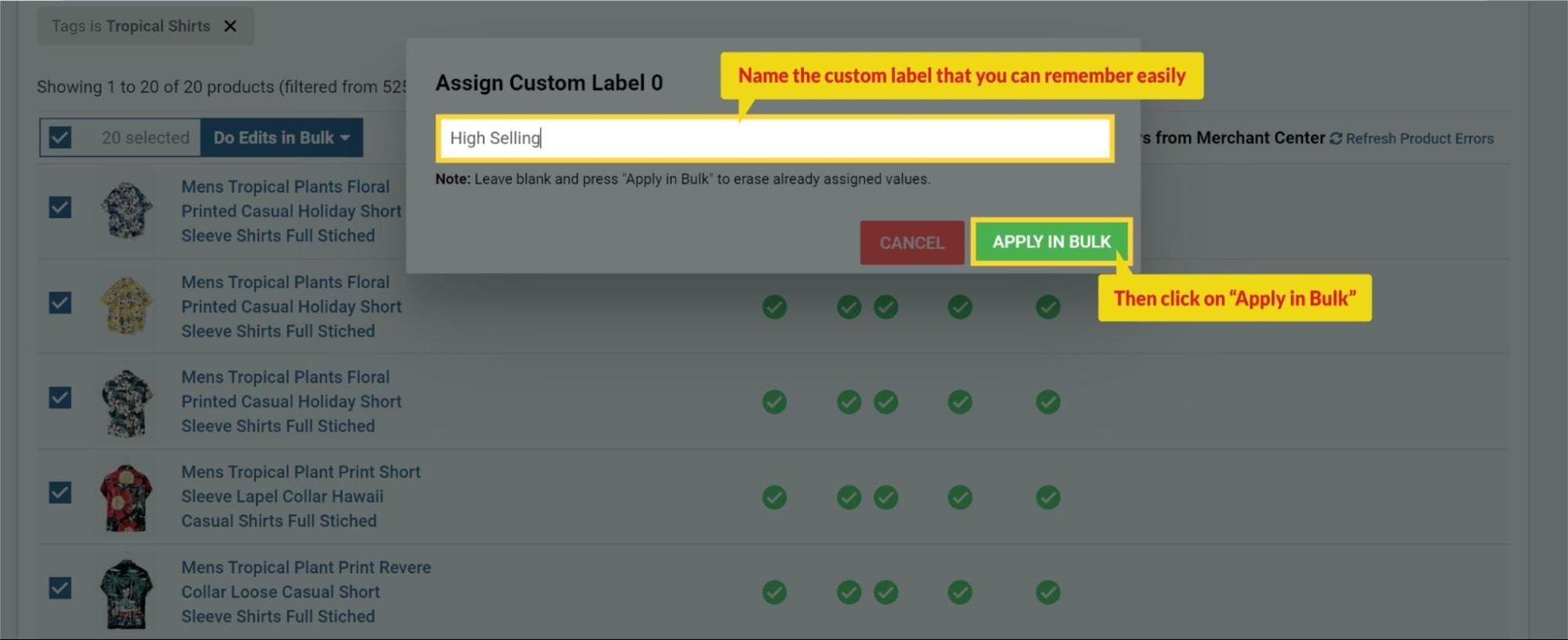 4. Here selecting Assign Custom Label 0 and name the custom label “High Selling” (Give any name which is easier for you to remember and helps you to differentiate why you have created the Custom Label) then click on “Apply in Bulk”