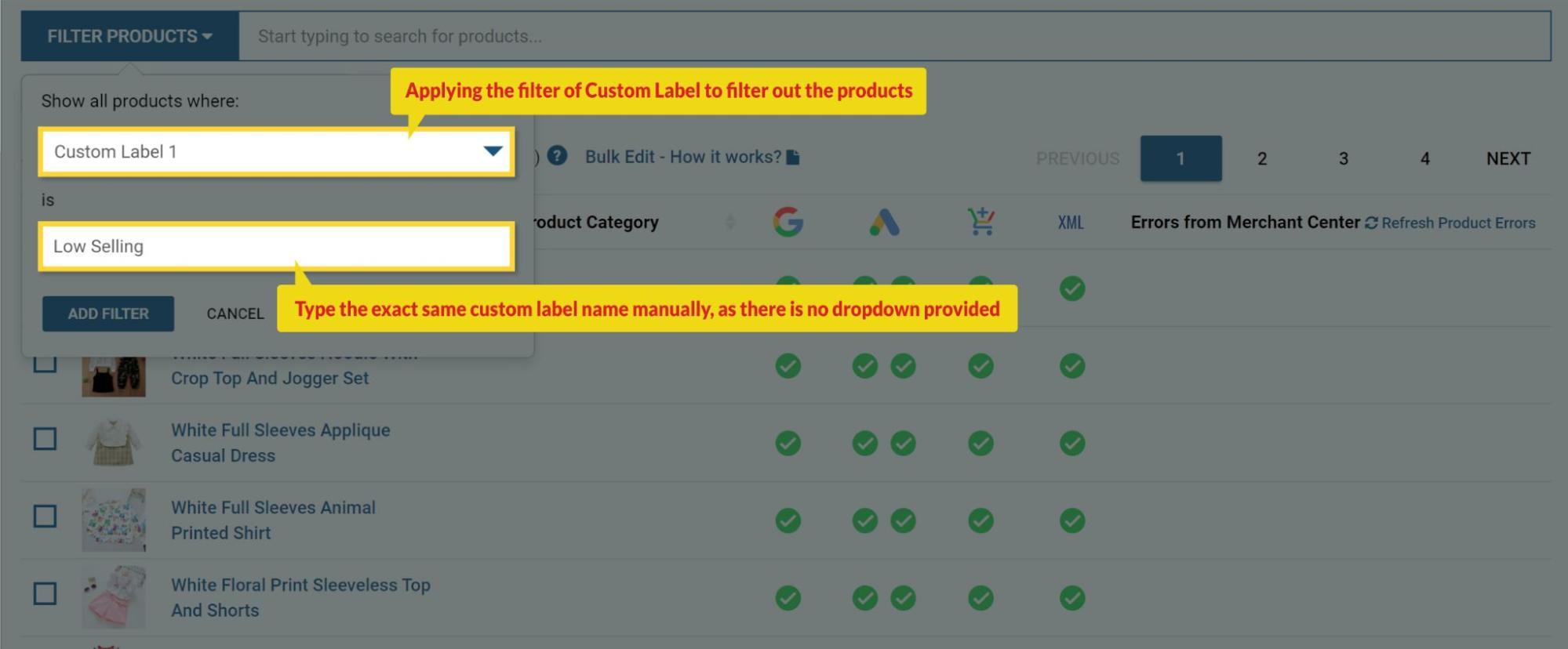 So, the list of the products will be filtered on which Custom Label 1 is applied as “Low Selling”.