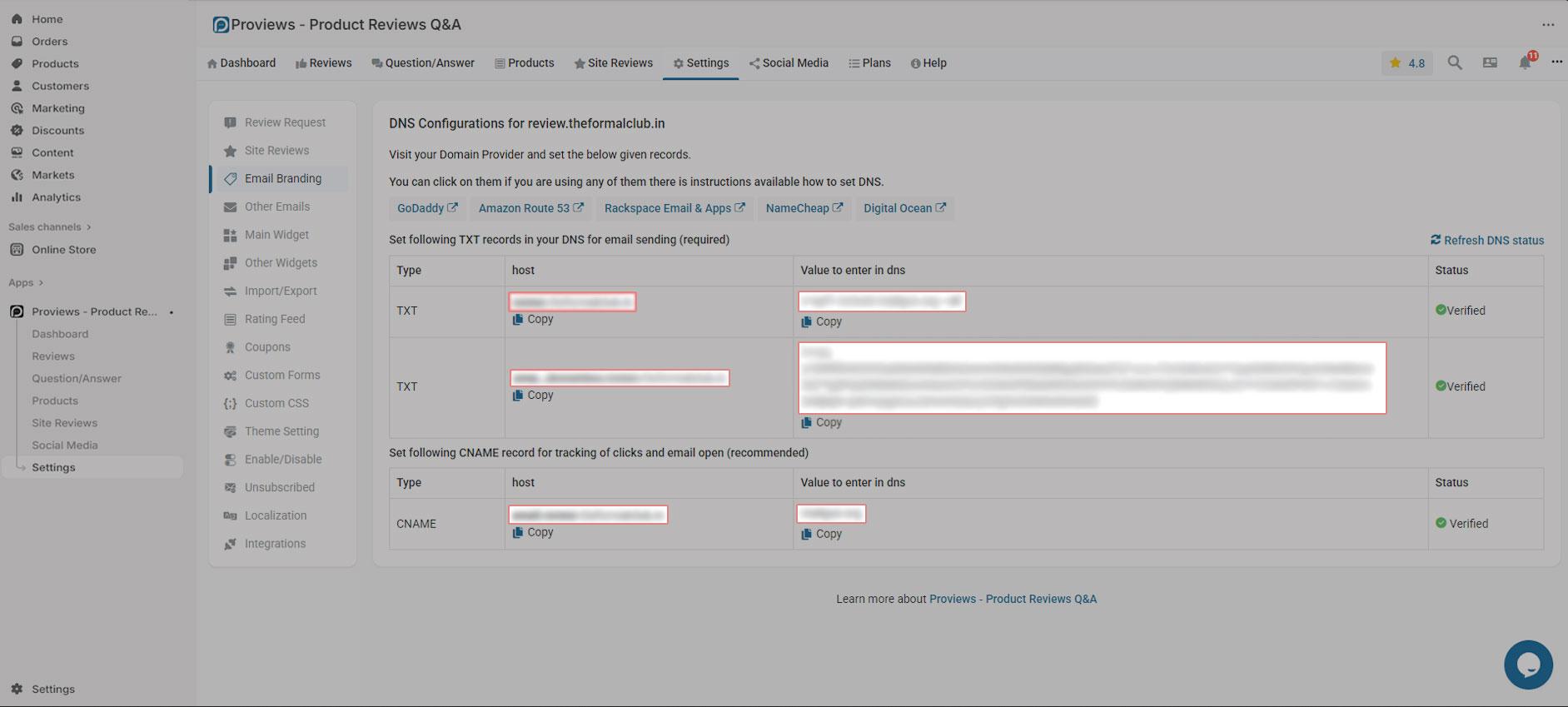 - You’ll see a list of TXT and CNAME records that need to be added to your DNS. (Please note that you have to add highlighted part only)
