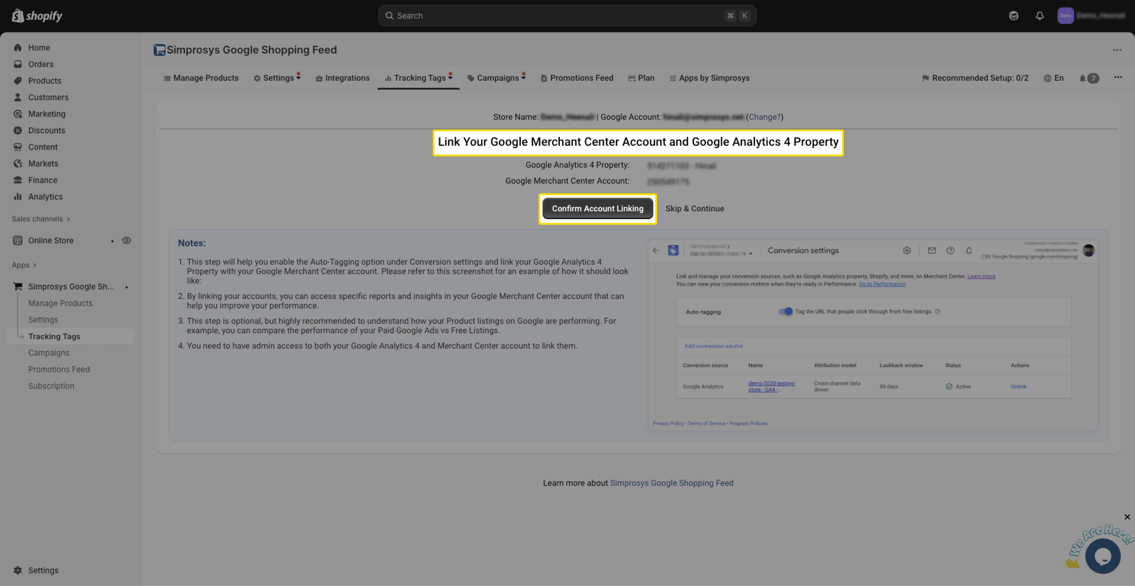This step will help you enable the auto-tagging option under conversion settings and link your GA4 property with your Google Merchant Center account. With this, you can access specific reports and insights in your merchant center and improve your performance. This step is optional but highly recommended to understand how your products are performing.