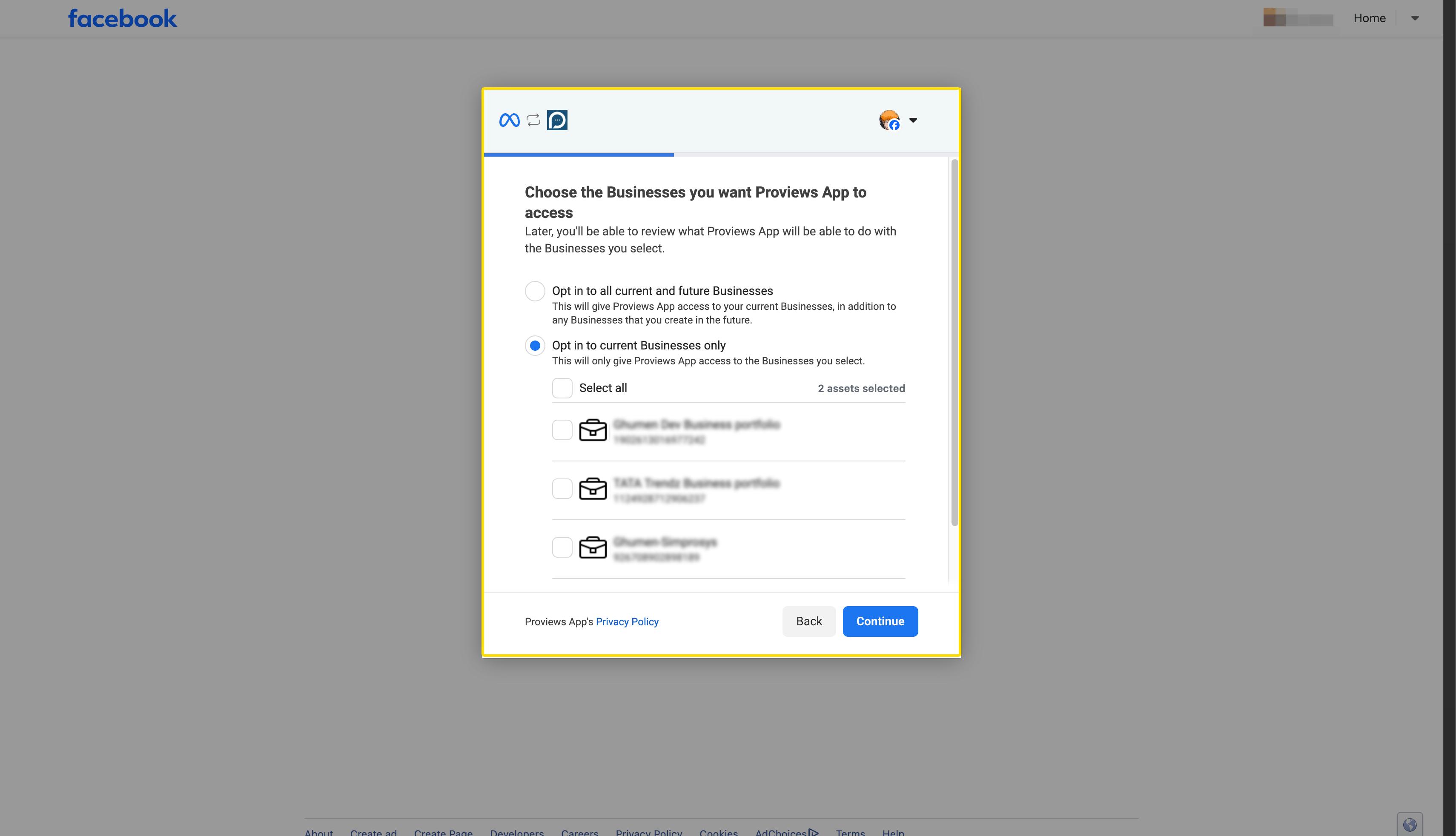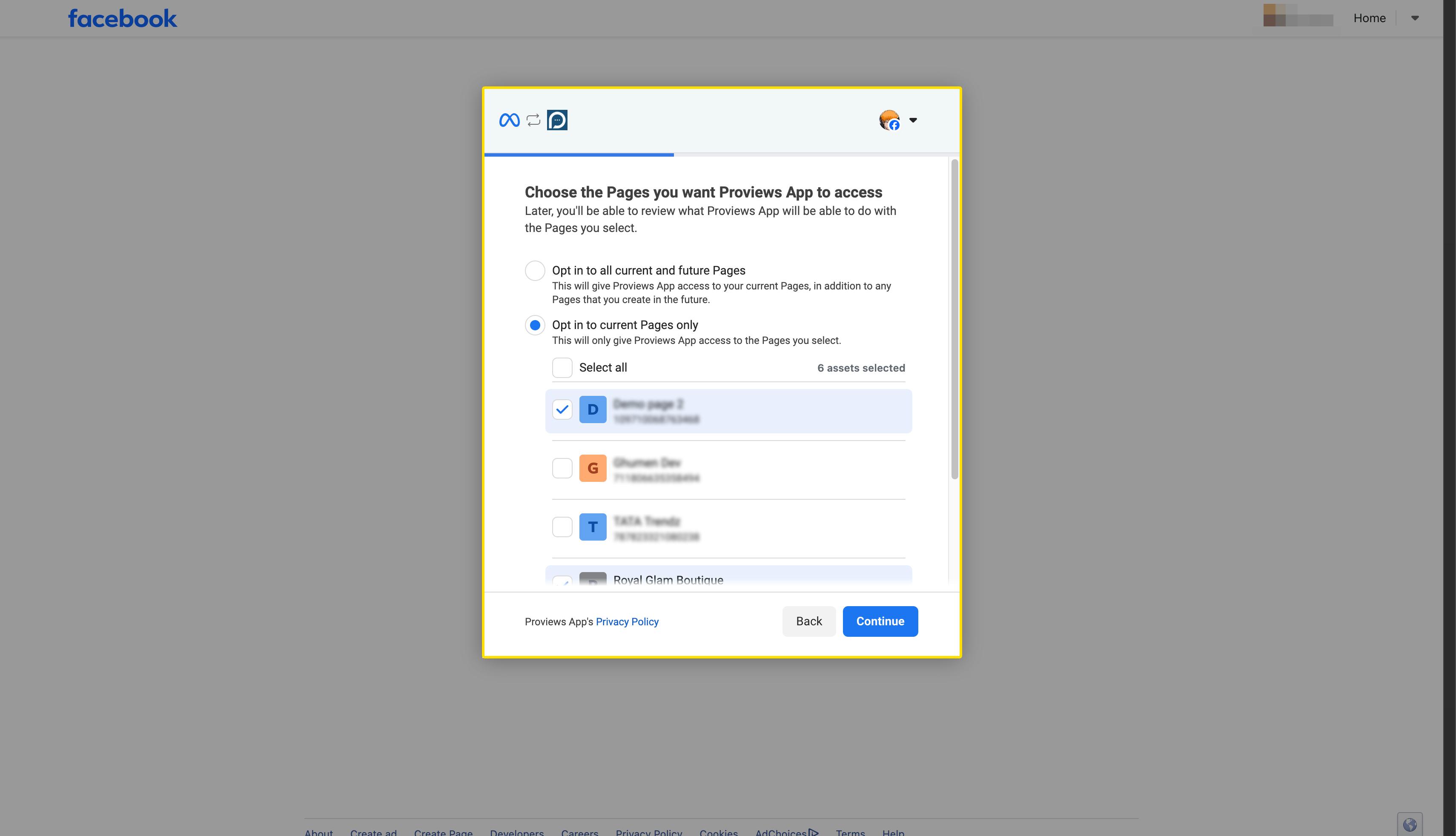a. After logging into Facebook, you must choose and connect the specific Facebook page and Instagram account where you want to post your reviews.
