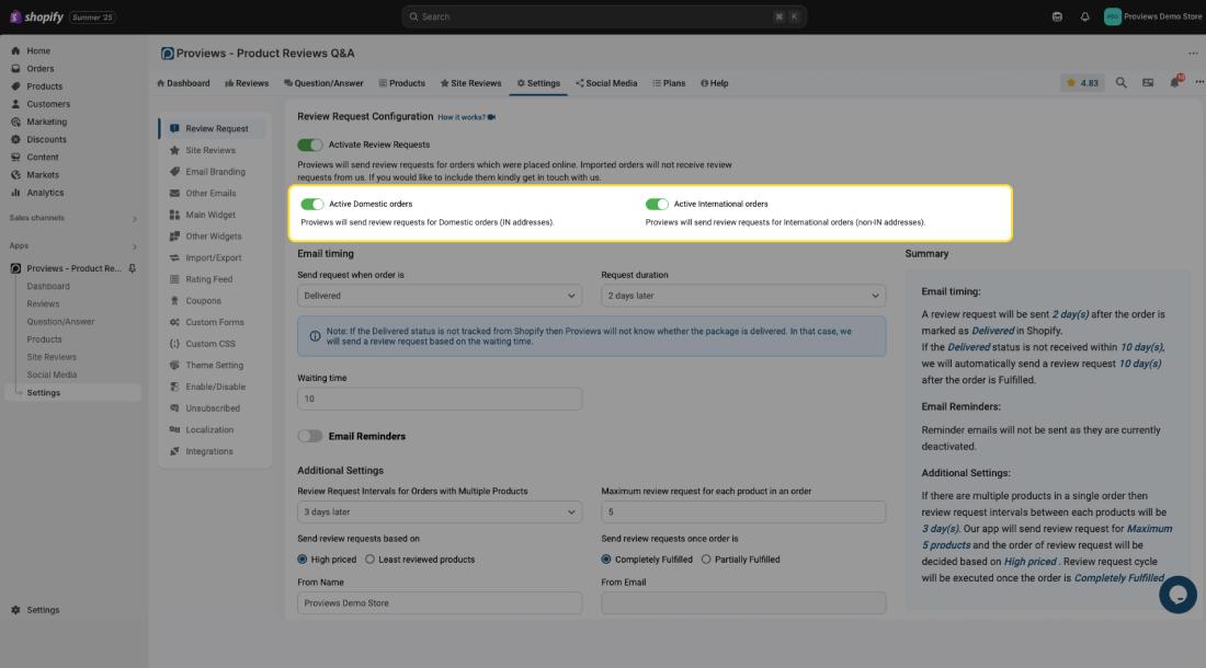 - Active Domestic Orders: Enable this to send review requests to customers with domestic (IN addresses) orders.