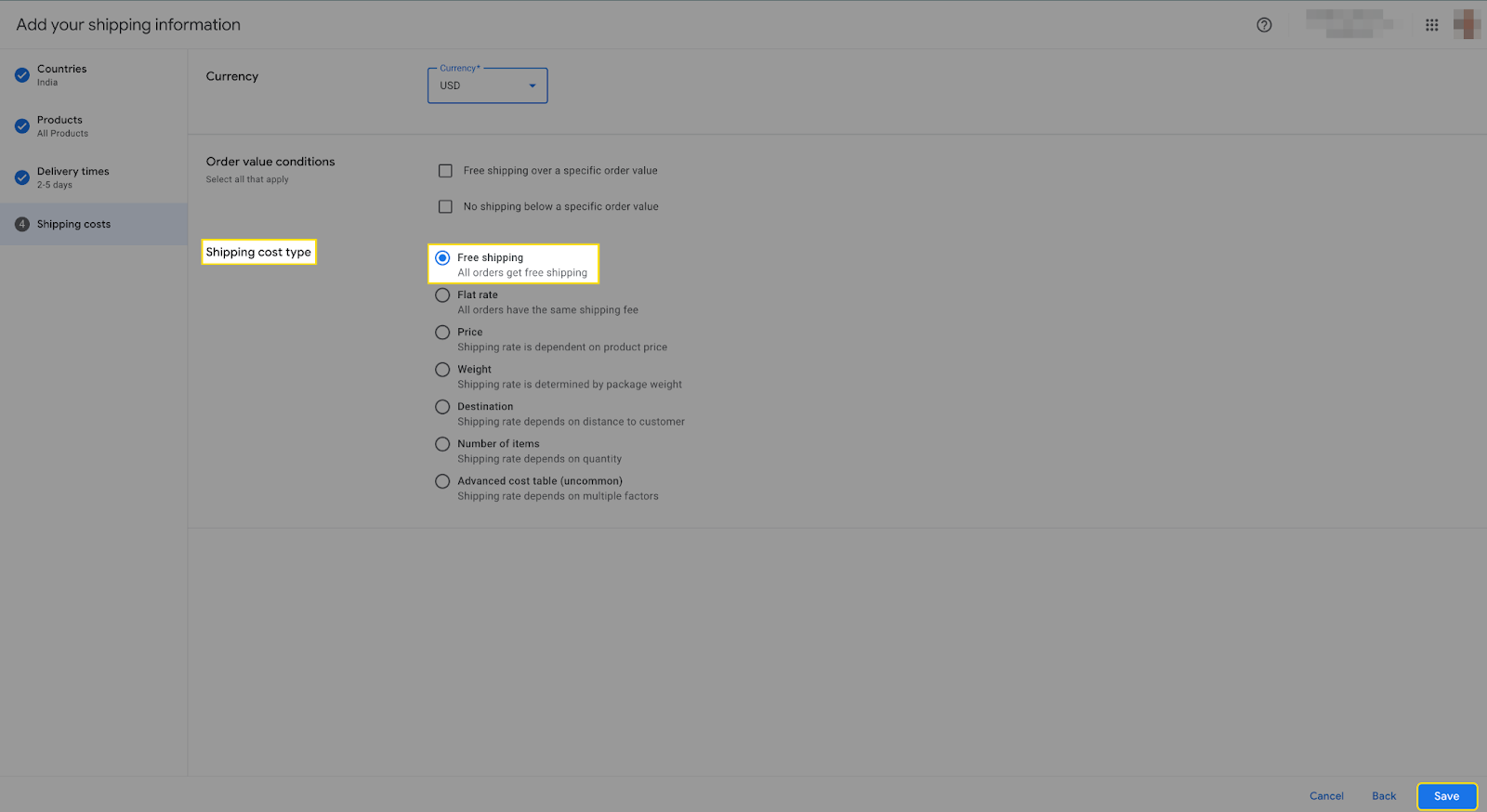 - Step 3: Now select the first option of free shipping in the shipping cost section, then click on Save.