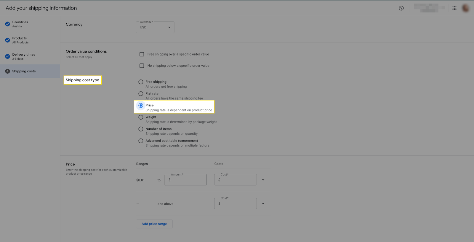 - Step 2: In the shipping cost section, select the third option, ‘Price’ in the shipping cost type.