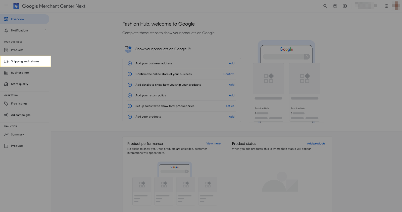 - Step 1: To setup the Shipping settings in Google Merchant Center, click on the "Shipping and Return" option under your business section in the left navigation panel.