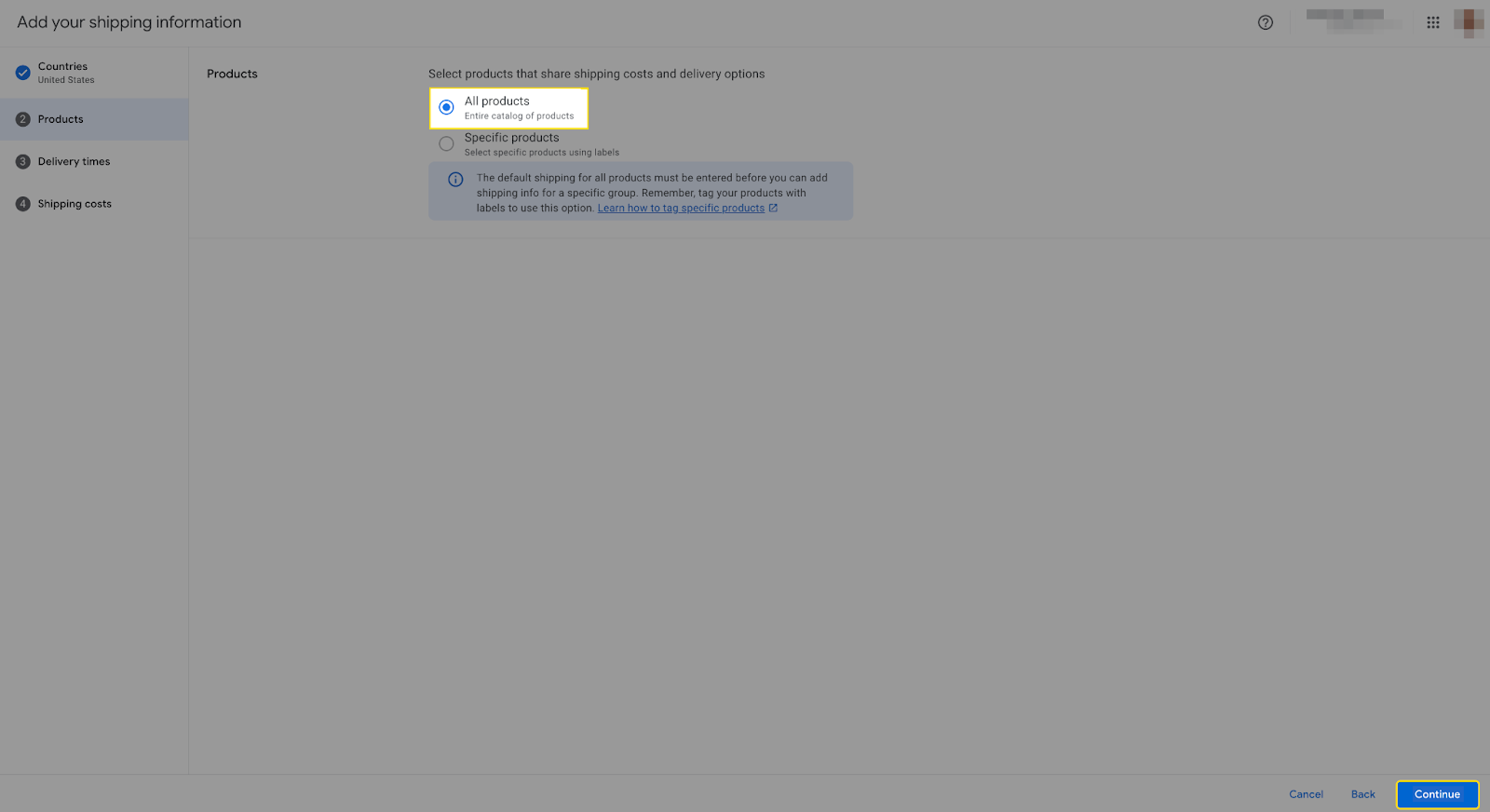 Select and proceed by clicking on Continue. You will have the option to create shipping for “All products” or for “specific products”.