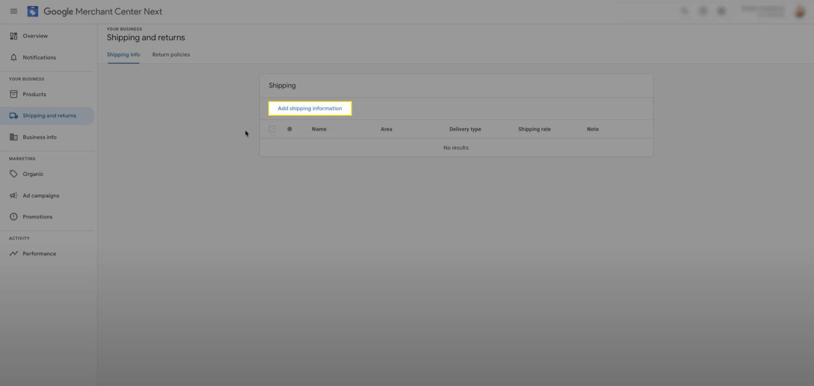 - Step 6: On the next page, you will see the shipping information added to the Merchant Center Next.