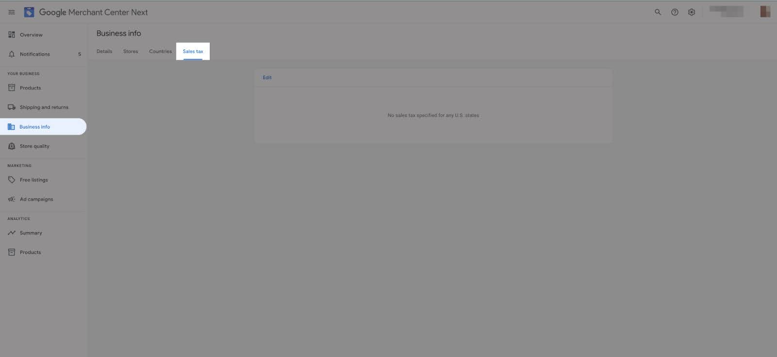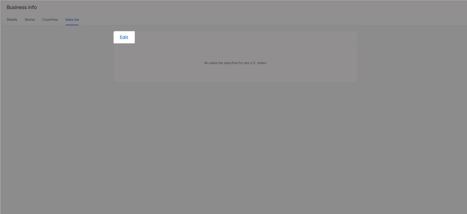Log in to your Google Merchant Center Next account, locate the option Business Info > Sales Tax > Edit