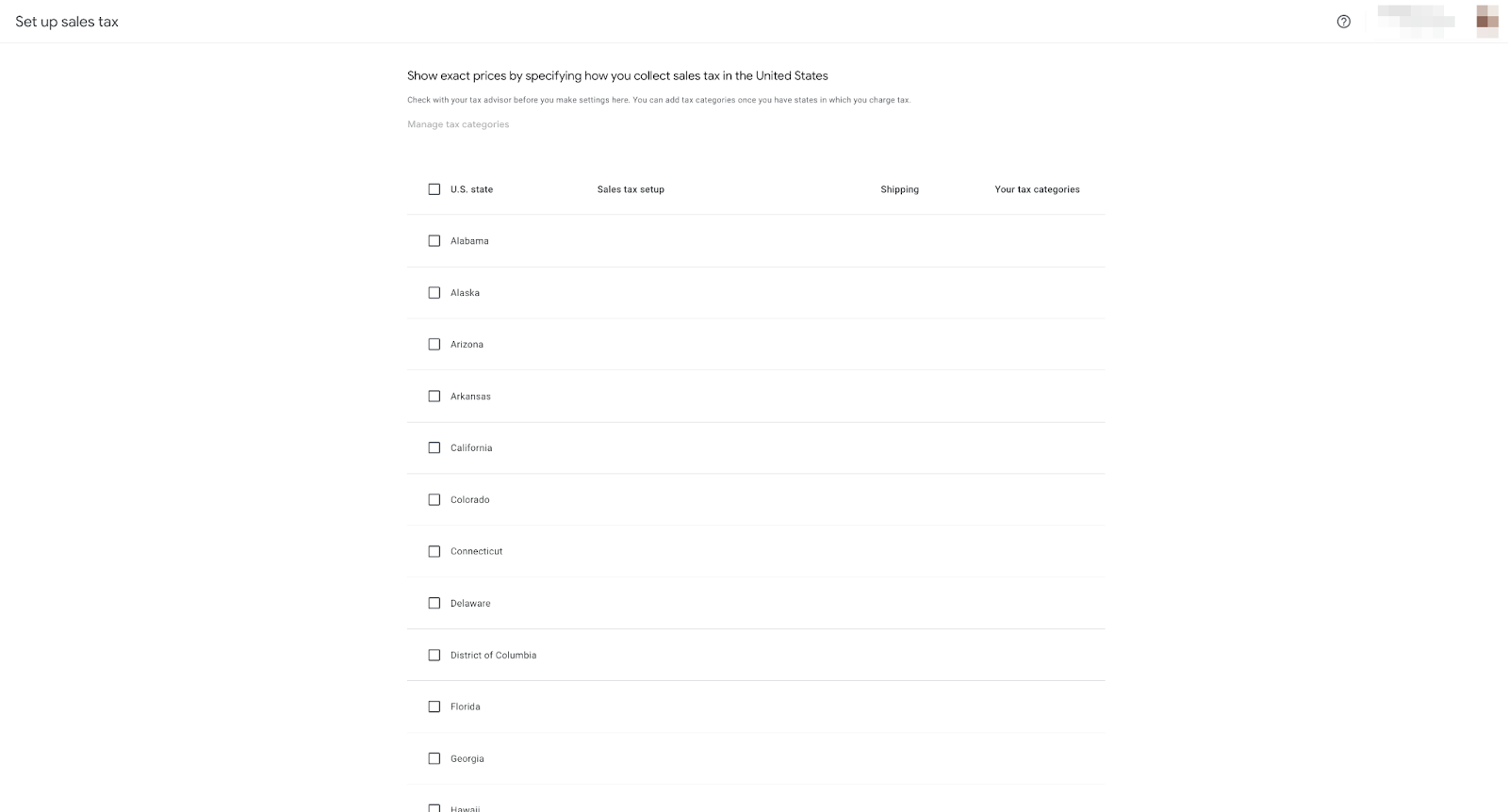 For merchants operating in the U.S., it is required to configure Sales Tax settings in Google Merchant Center Next for each state where taxes are charged. The sales tax configuration must be set up separately for each state. If there are states where you do not charge taxes will still be required to indicate this within the Merchant Center Tax Settings.