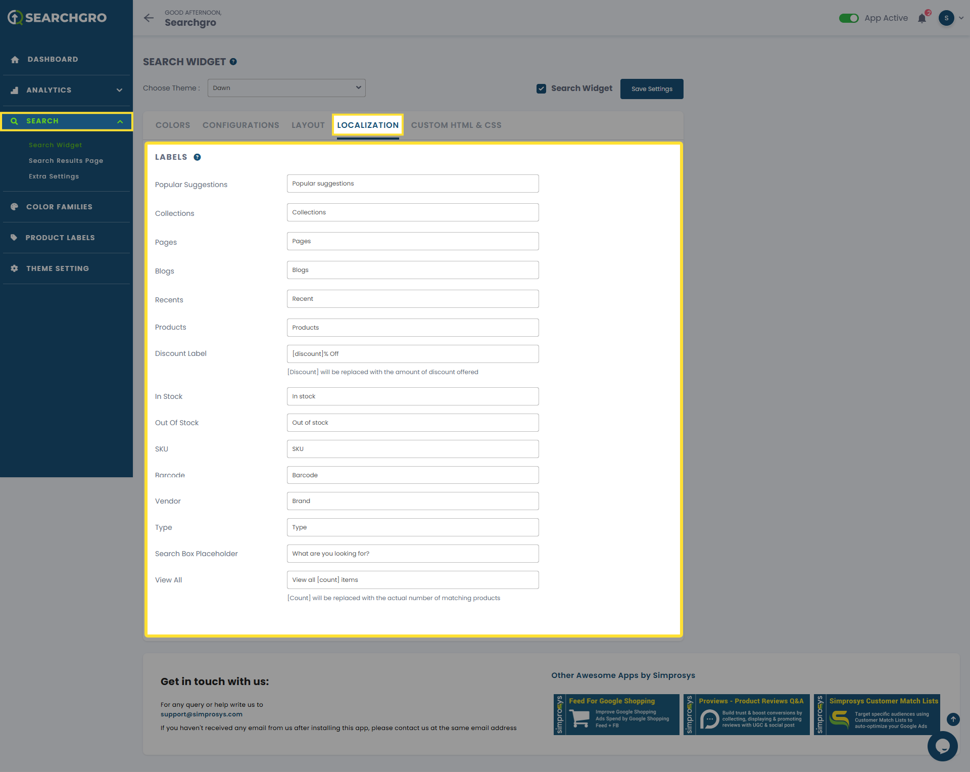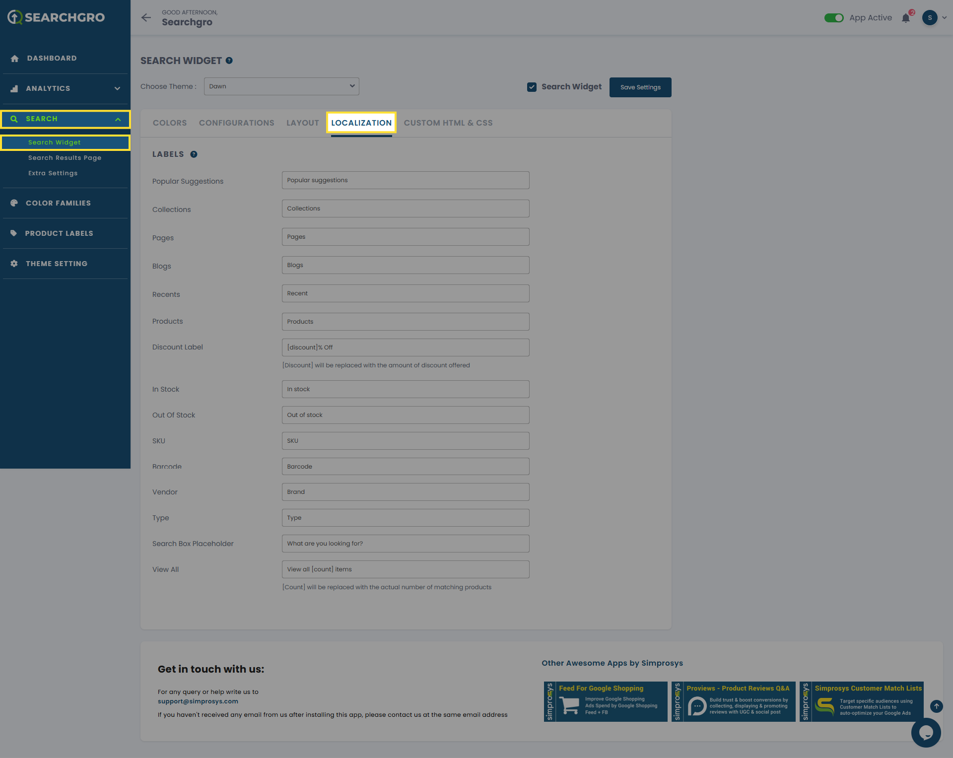 The SearchGro app for Shopify allows you to customize the language used for various labels and text elements within the Search Widget to cater to a global audience or match your Shopify store's language.