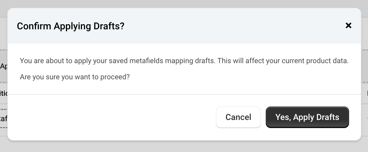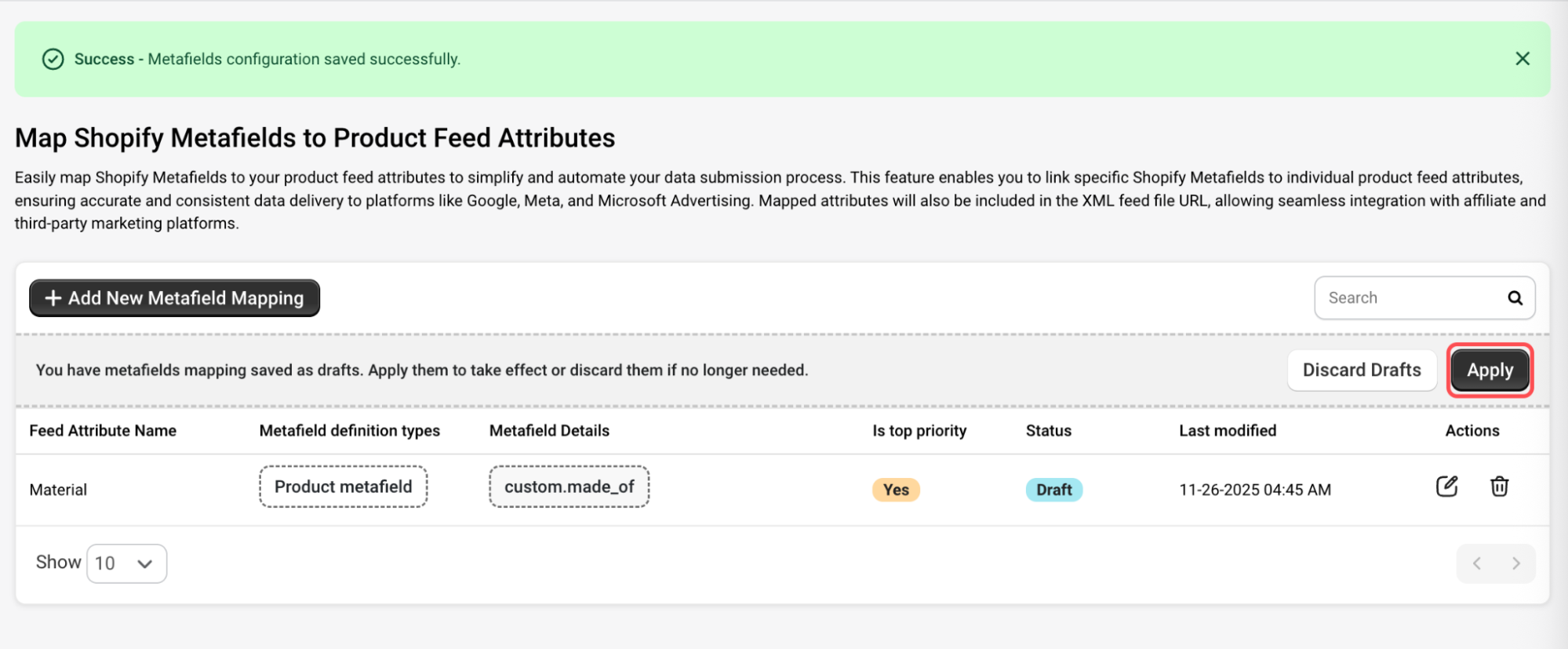 If the same "Product Feed Attribute" and "Shopify Metafield" are present in a draft and users enter the same information twice, the first draft will be replaced.