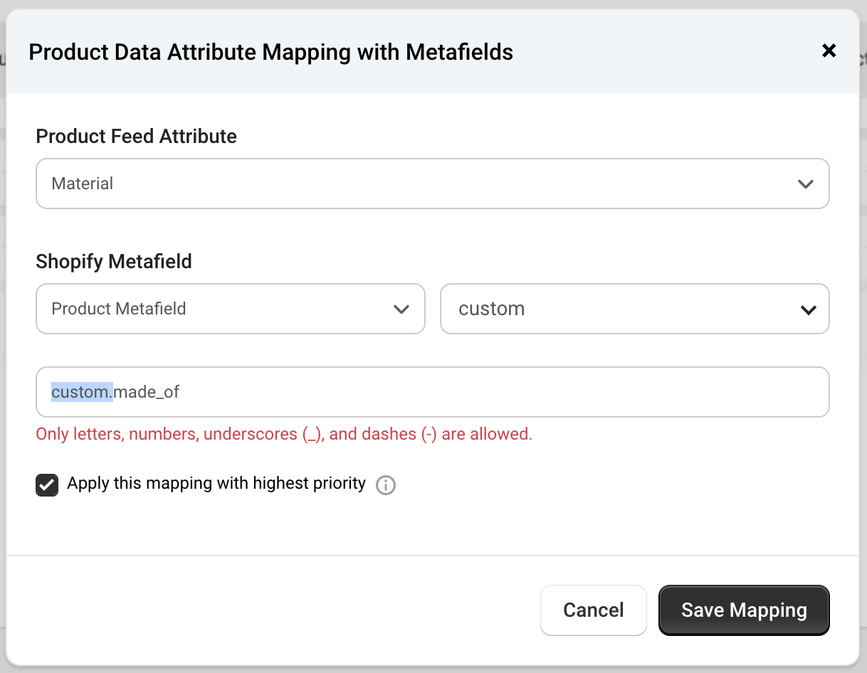 5. Priority option (optional): Enable this to give the mapping highest priority. This will overwrite values from Shopify variant options in the app, but note that Automated Rules always take precedence and cannot be overwritten.