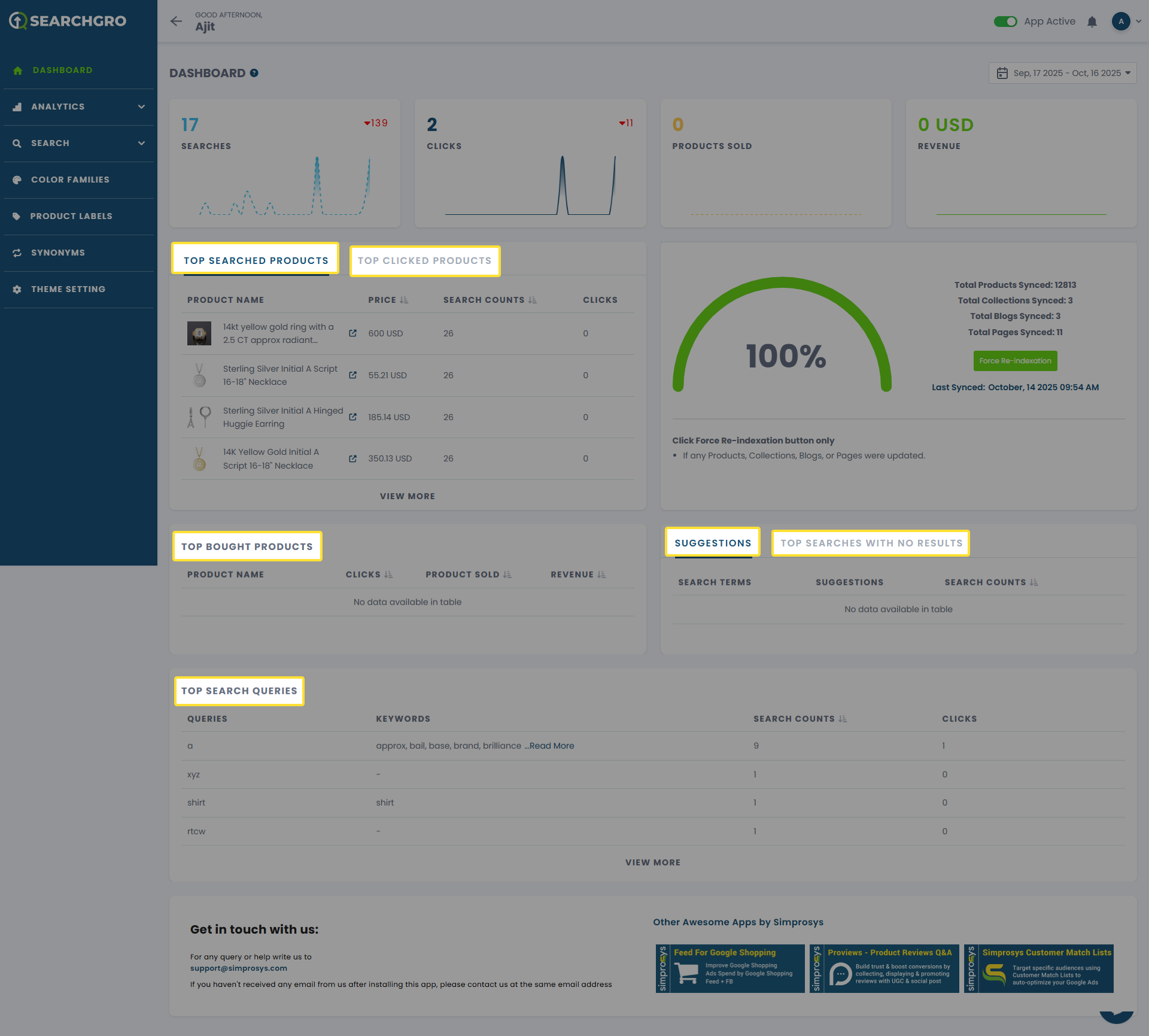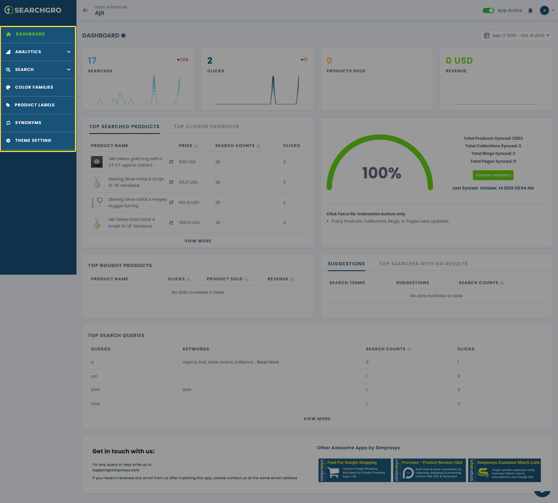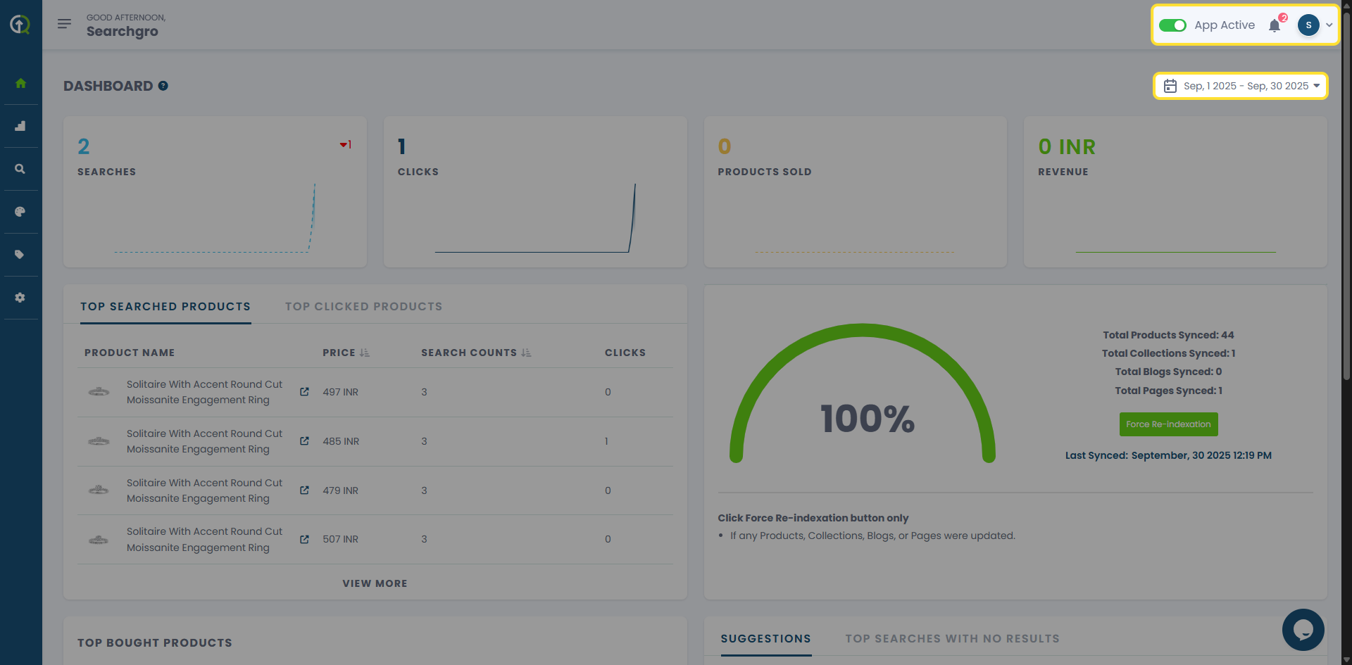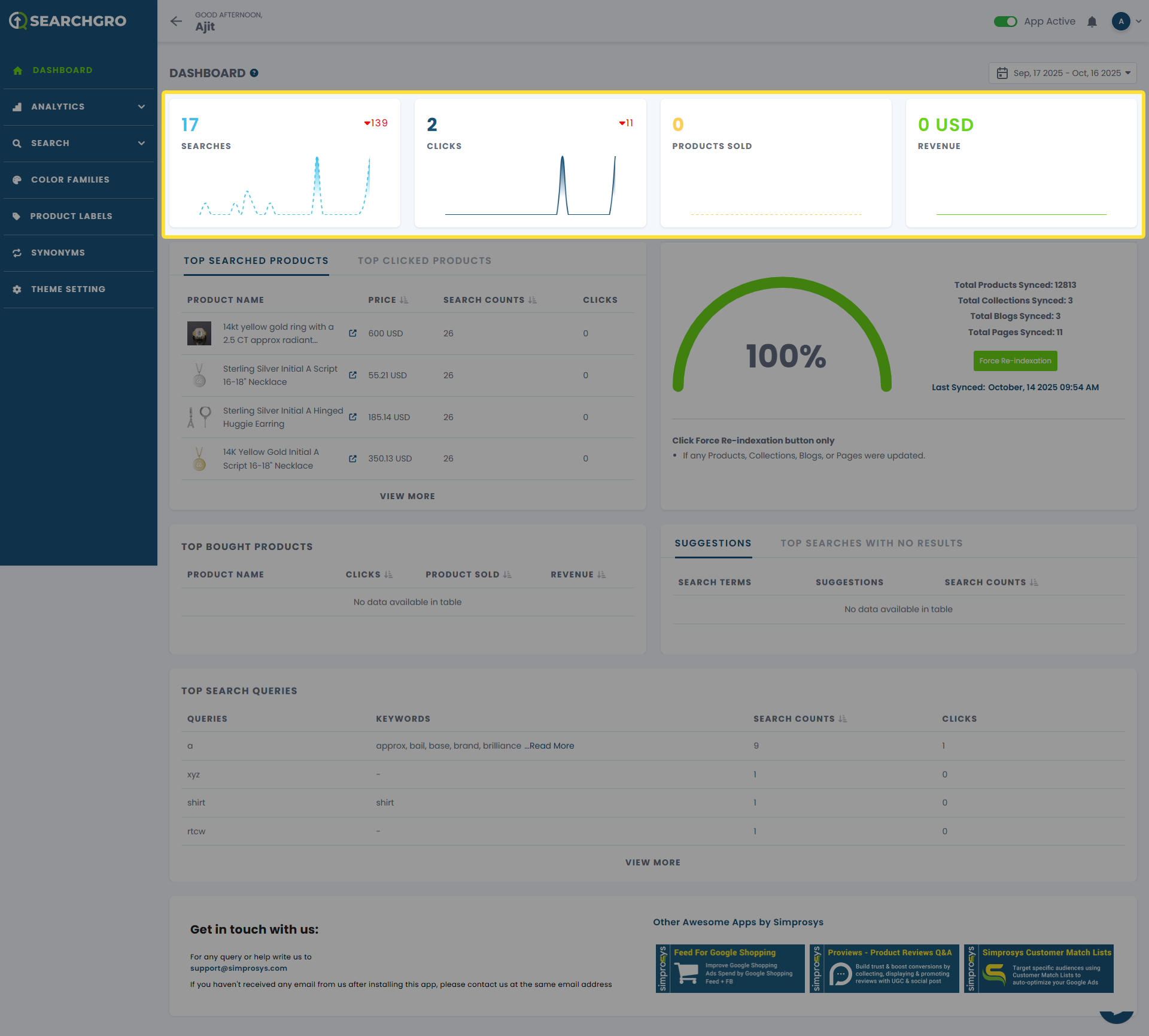 Once installation and setup are complete, you’ll be directed to the SearchGro App Dashboard, your central hub for managing search settings and viewing analytics.