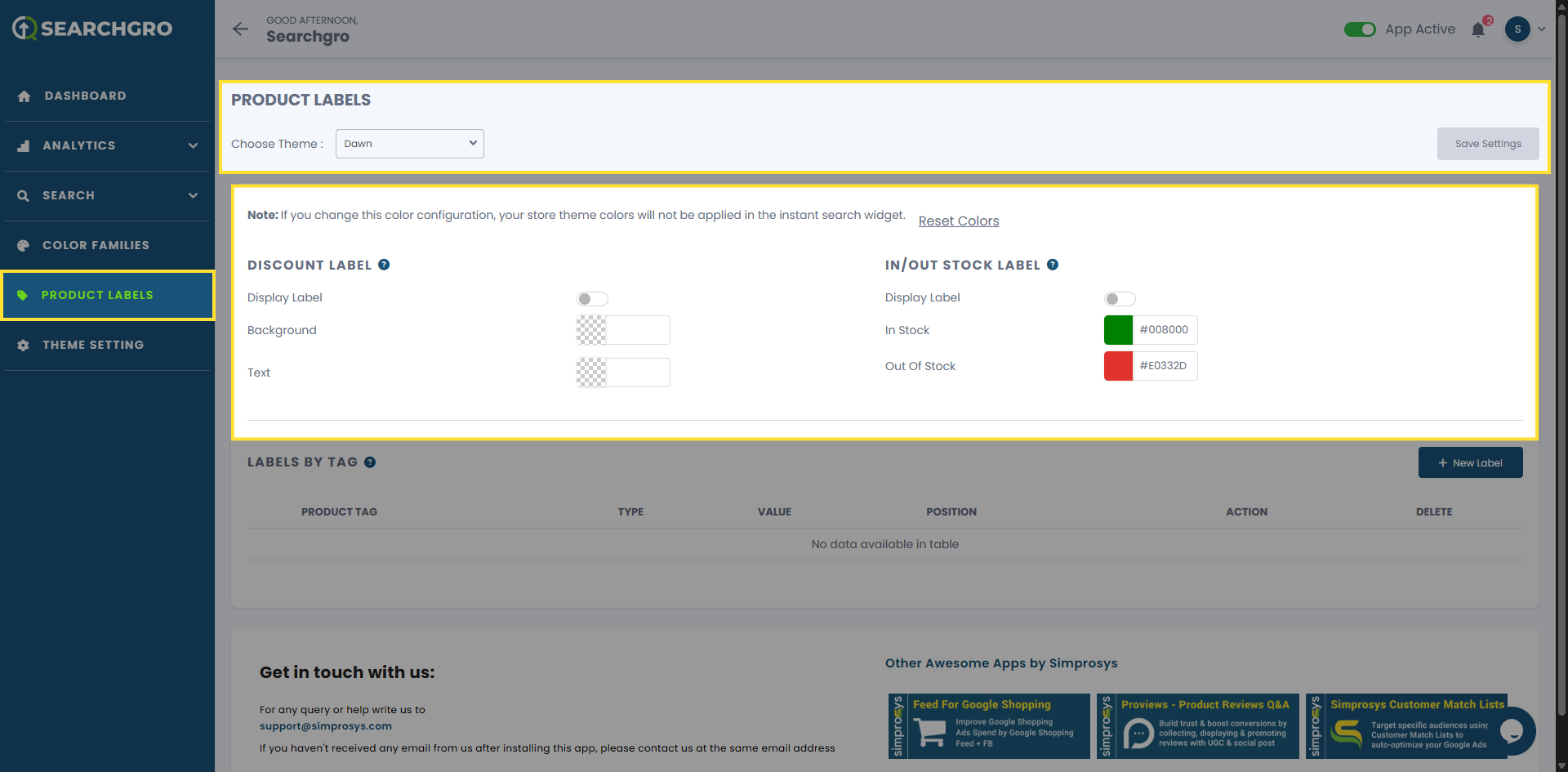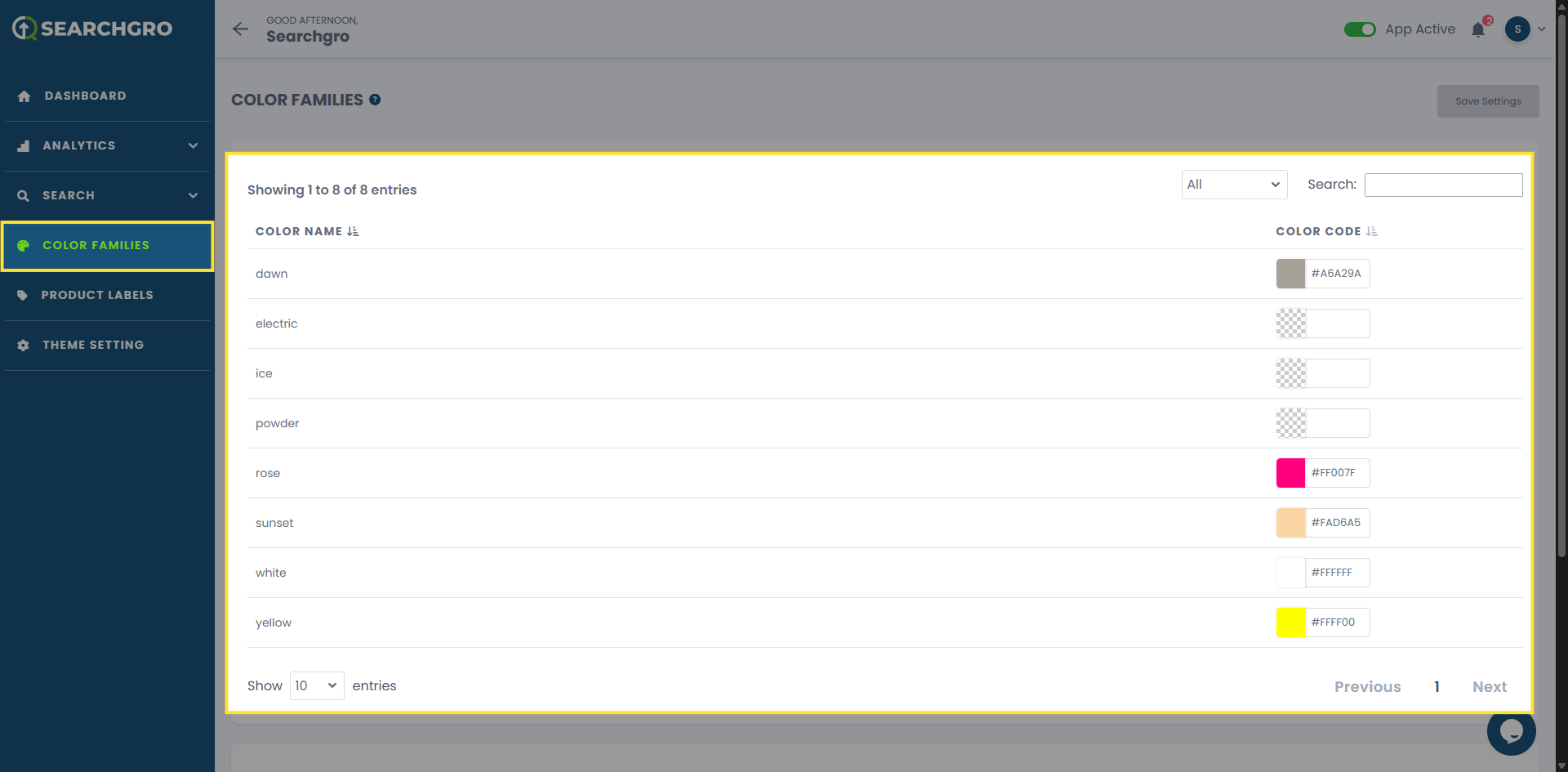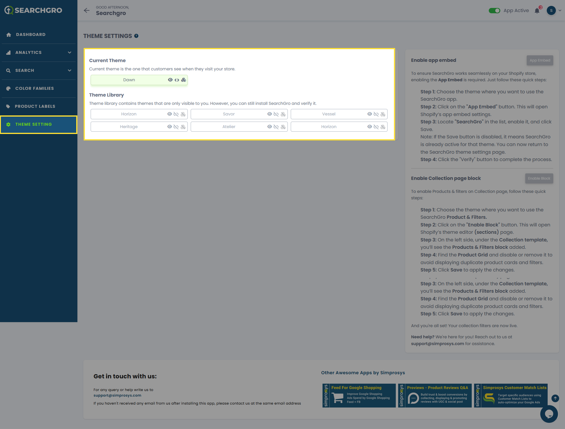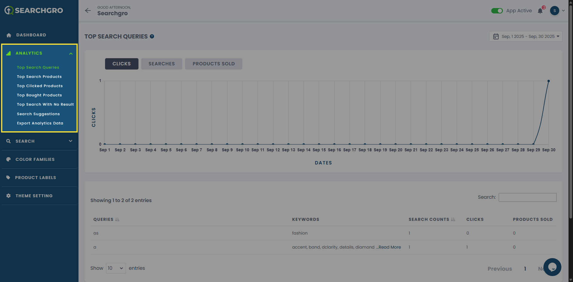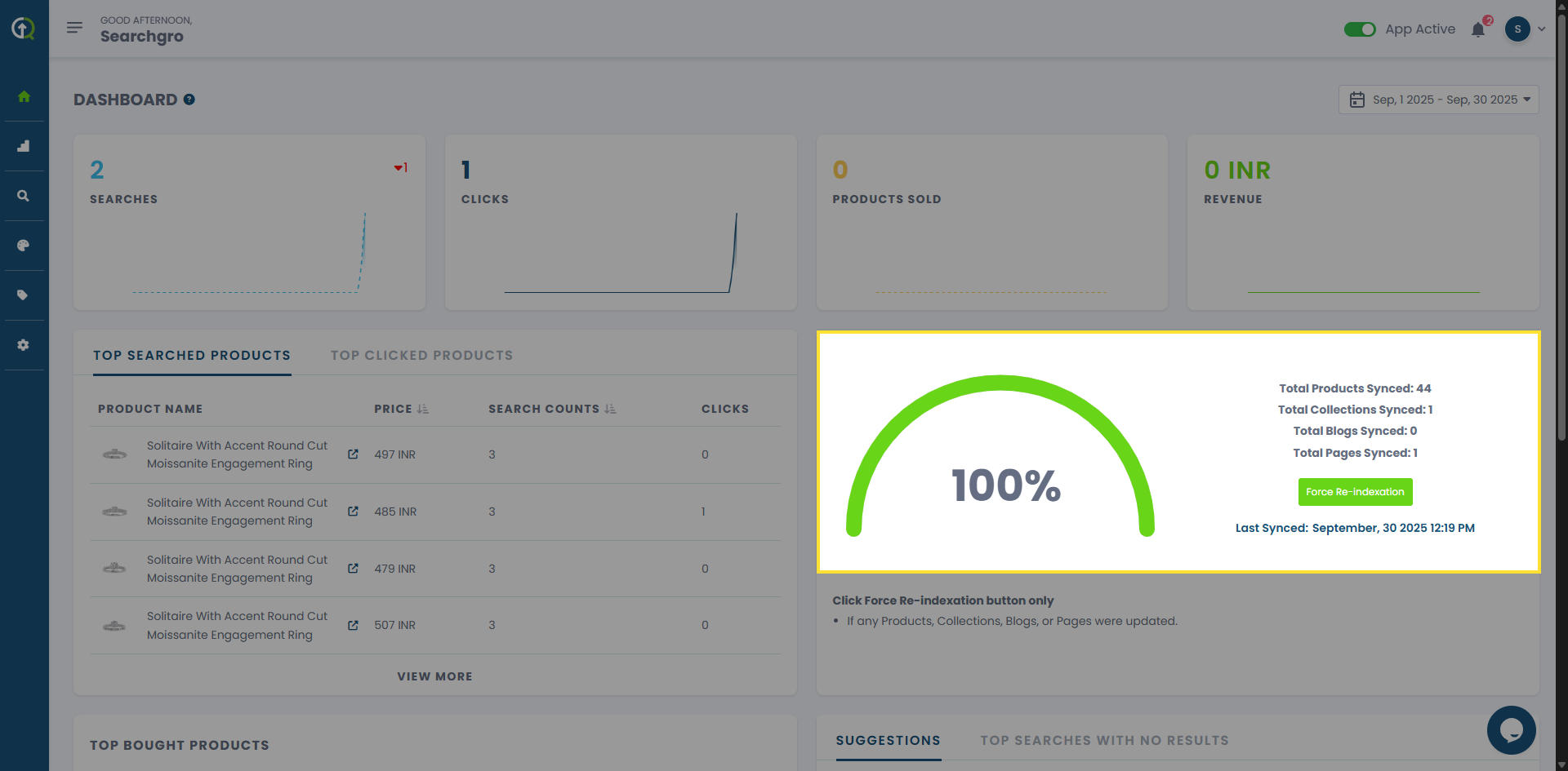 Once installation and setup are complete, you’ll be directed to the SearchGro App Dashboard, your central hub for managing search settings and viewing analytics.