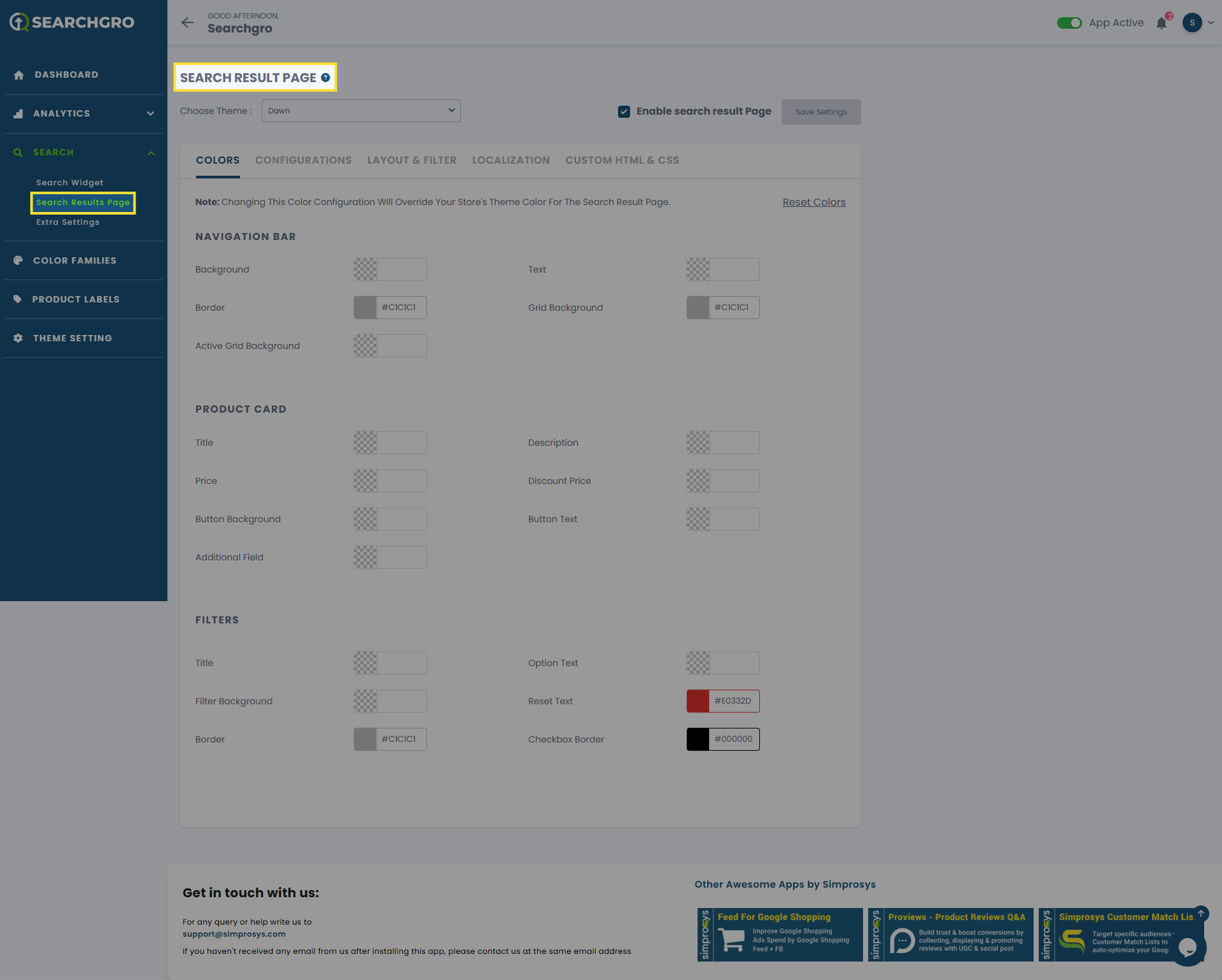 - Search Results Page → Configure the dedicated results page (colors, products, collections, pages, blogs, filters, layout, localization, custom HTML/CSS).