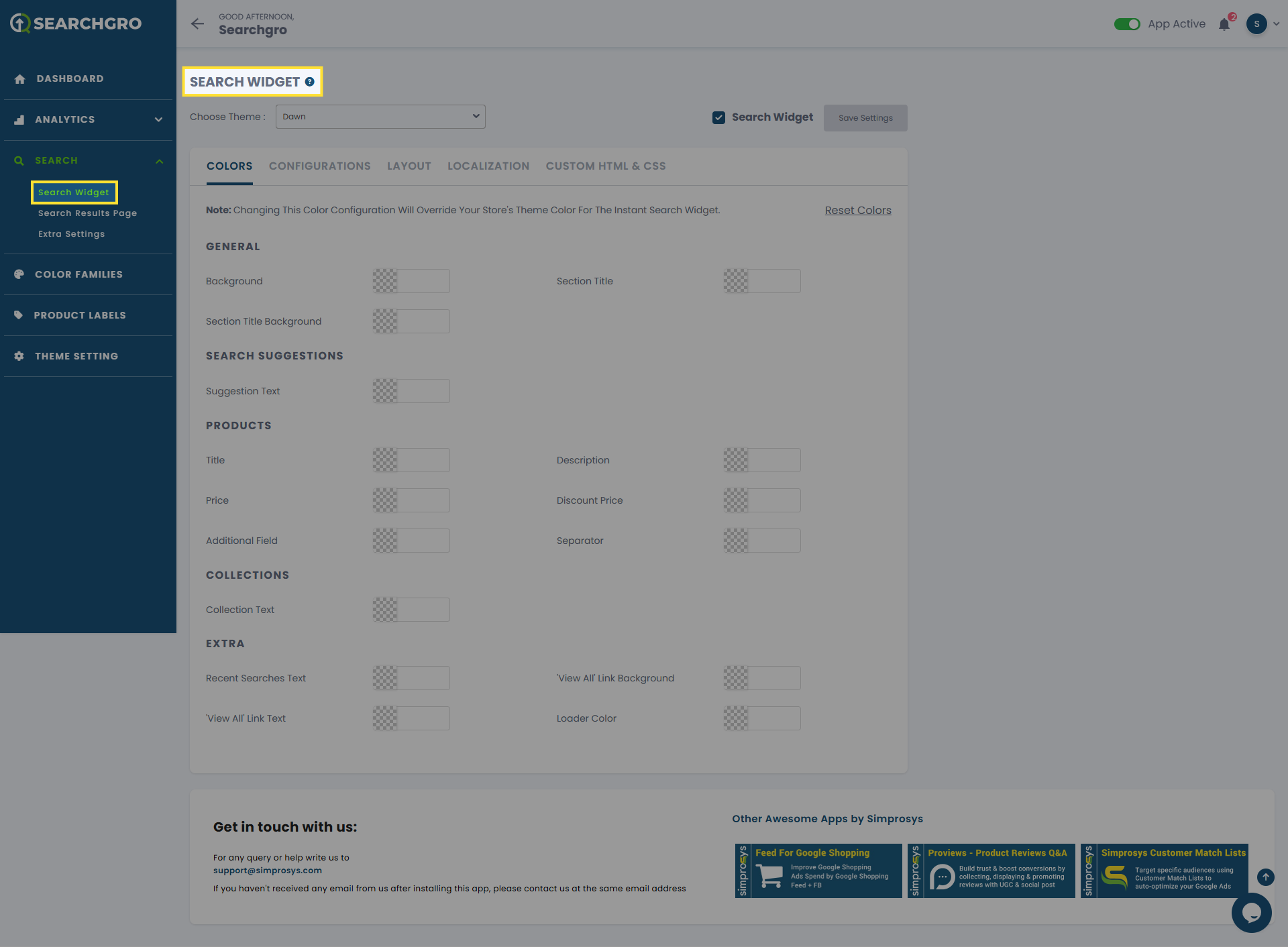 - Search Widget → Customize the instant search (colors, layout, search features, suggestions, collections, pages, blogs, products, localization, custom HTML/CSS).