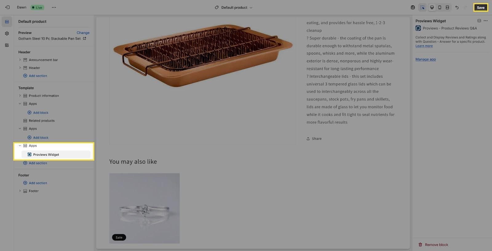 - From the left sidebar, click Add section → Proviews widget.