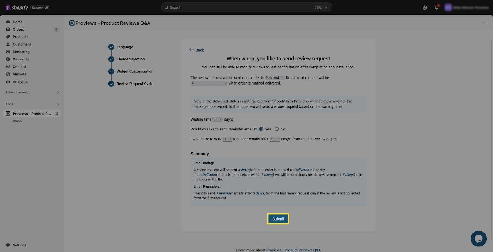 - Want to follow up with customers who haven’t reviewed yet? Choose “Yes” to send reminder emails, or “No” to skip them.