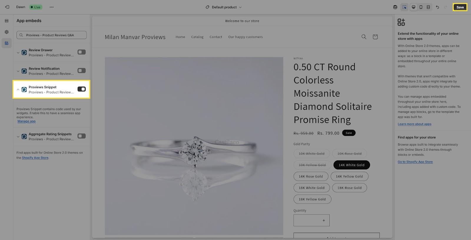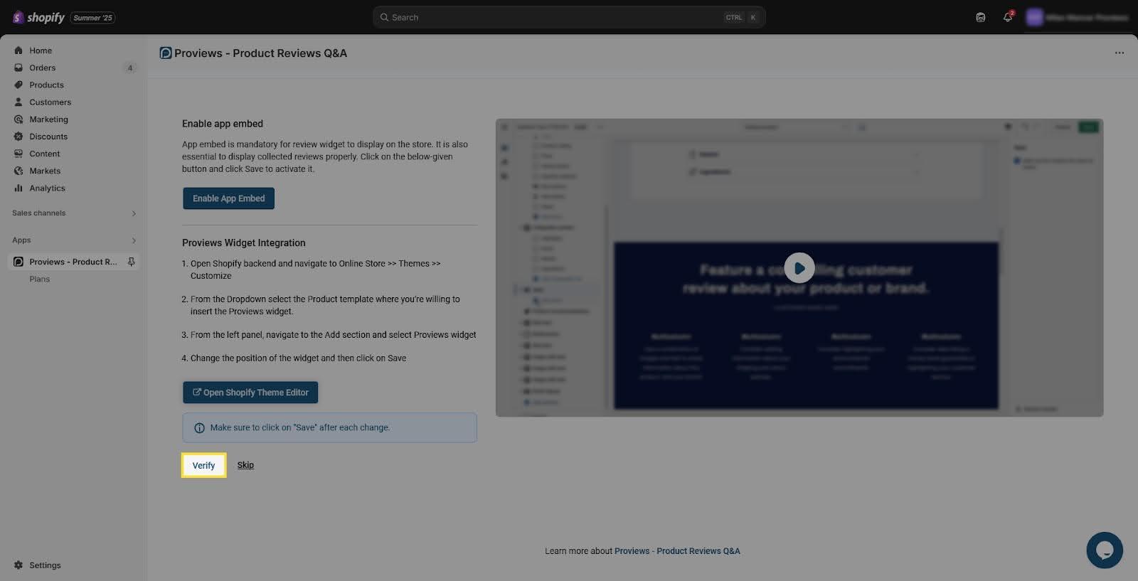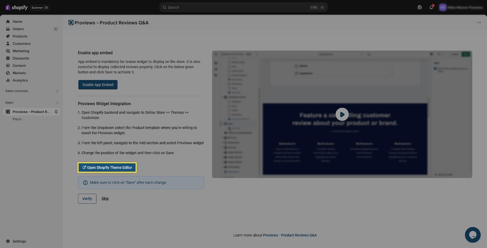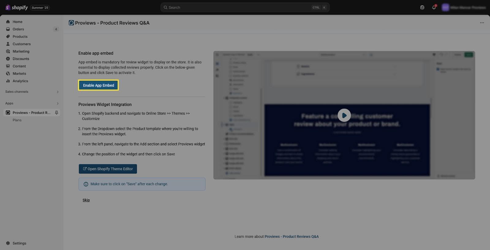 5. Enable the App Embed and integrate Proviews Widget in Your Theme